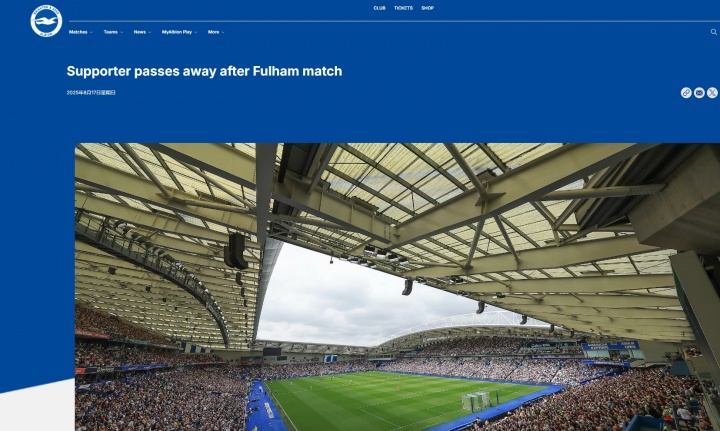 布莱顿官网写谈:“在对阵富勒姆的比赛完好意思后,咱们哀悼地晓示又名72岁的男性球迷不欢快离世。这位先生在比赛下半场于东看台表层突发不适,尽管急救东谈主员、俱乐部职责主谈主员及医疗团队全力抢救,仍未能挽回他的人命。”