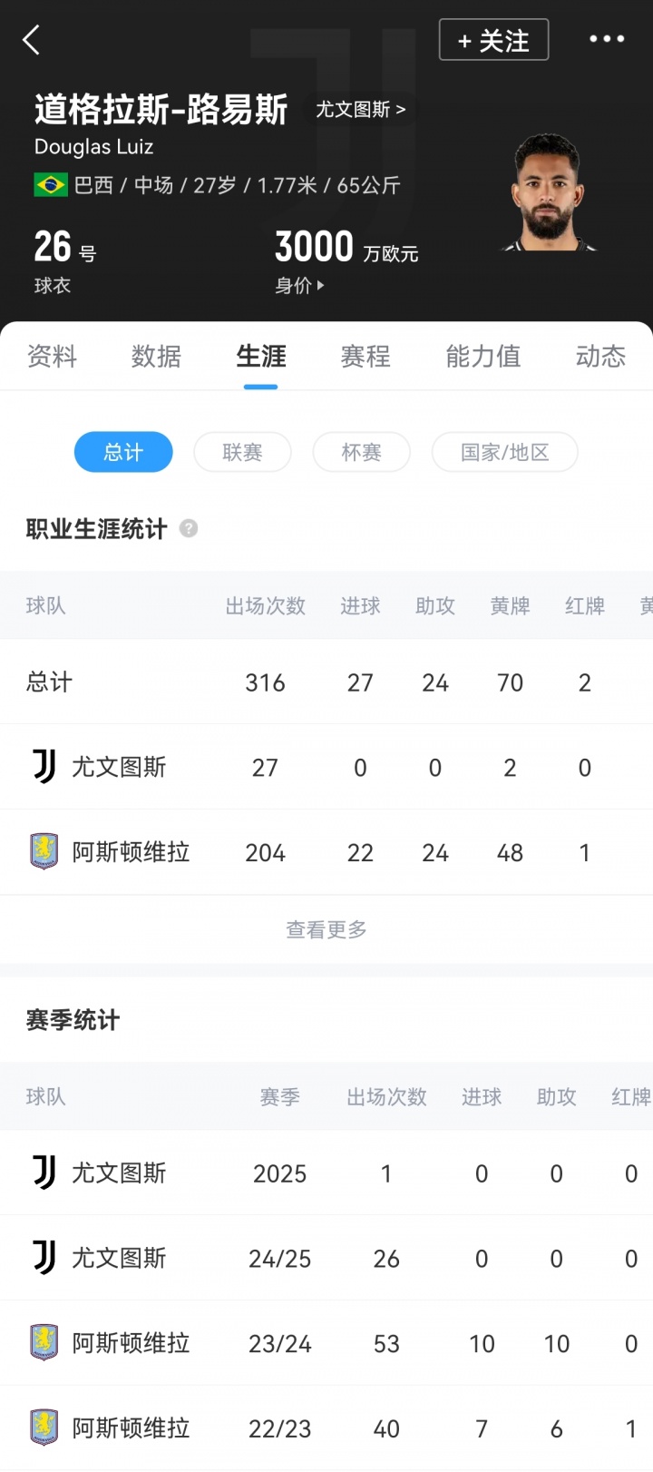 谈格拉斯-路易斯客岁夏窗以5150万欧元的转会费从维拉加盟尤文,但悉数2024/25赛季,谈格拉斯-路易斯只出场26次,莫得孝敬任何进球或助攻。