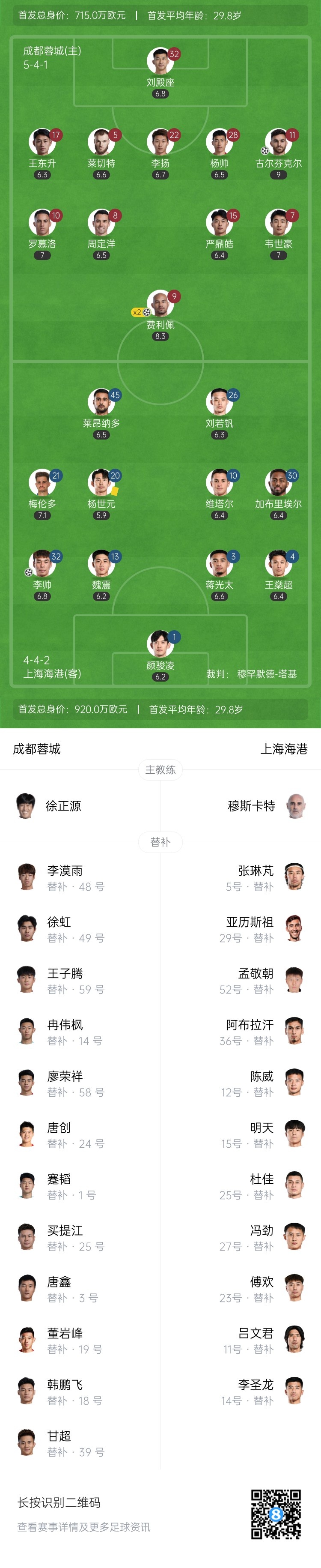 第30分钟,费利佩点射破门,本场已梅开二度,成齐蓉城2-0起先上海海港↓