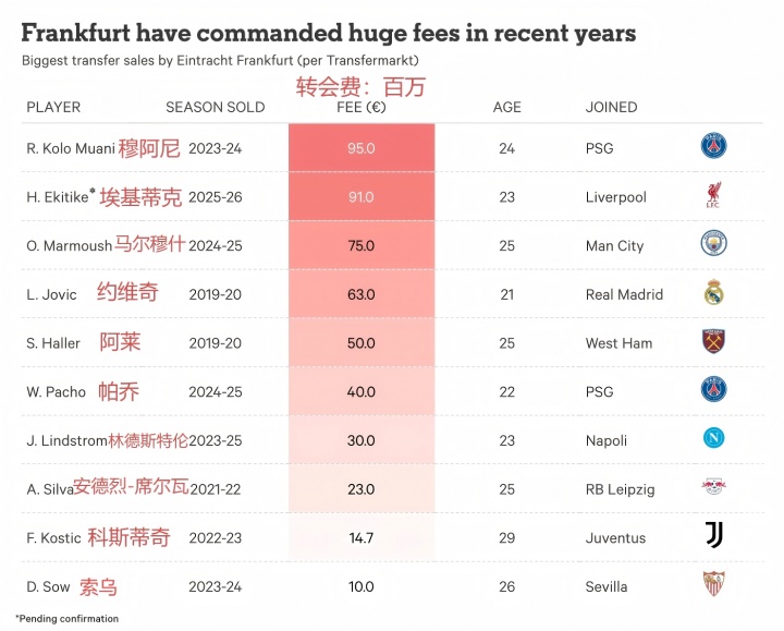 在此之前,法兰克福最大的两笔收益是穆阿尼和马尔穆什,这两东谈主均以目田身加盟,转会费觉得高达1.65亿欧。