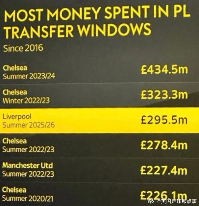 💰英超转会窗砸钱榜单:切尔西4.35亿镑第1,利物浦2.95亿镑第3