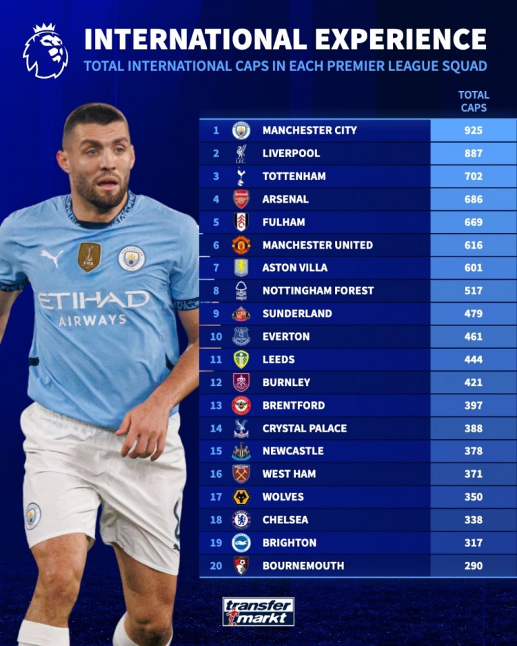 英超各队球员国度队出战场次榜:曼城925场居首,利物浦887场次席