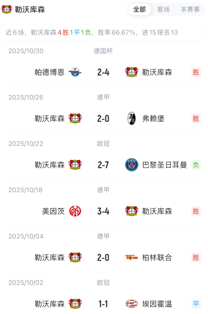 勒沃库森首发:1-弗莱肯、4-宽萨、5-巴代、12-塔普索巴、13-阿图尔、44-贝洛西安、24-阿莱克斯·加西亚、8-安德里希、19-波库、9-埃切维里、14-希克