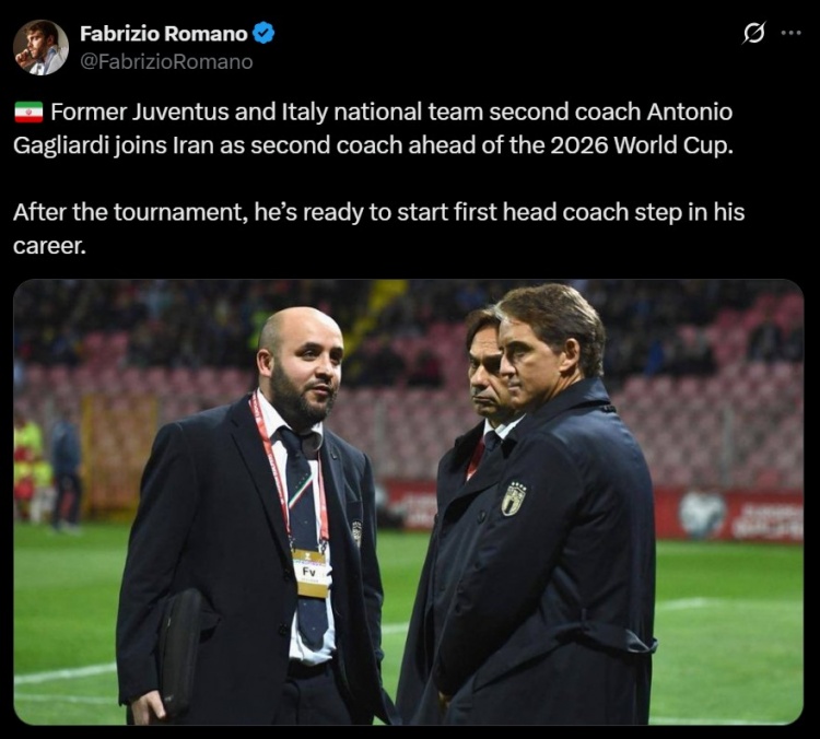 11月8日讯 罗马诺报说念,前尤文、意大利国度队助理培植加利亚尔迪(上图图左)加入伊朗国度队培植组,担任助理培植,备战2026年寰球杯。